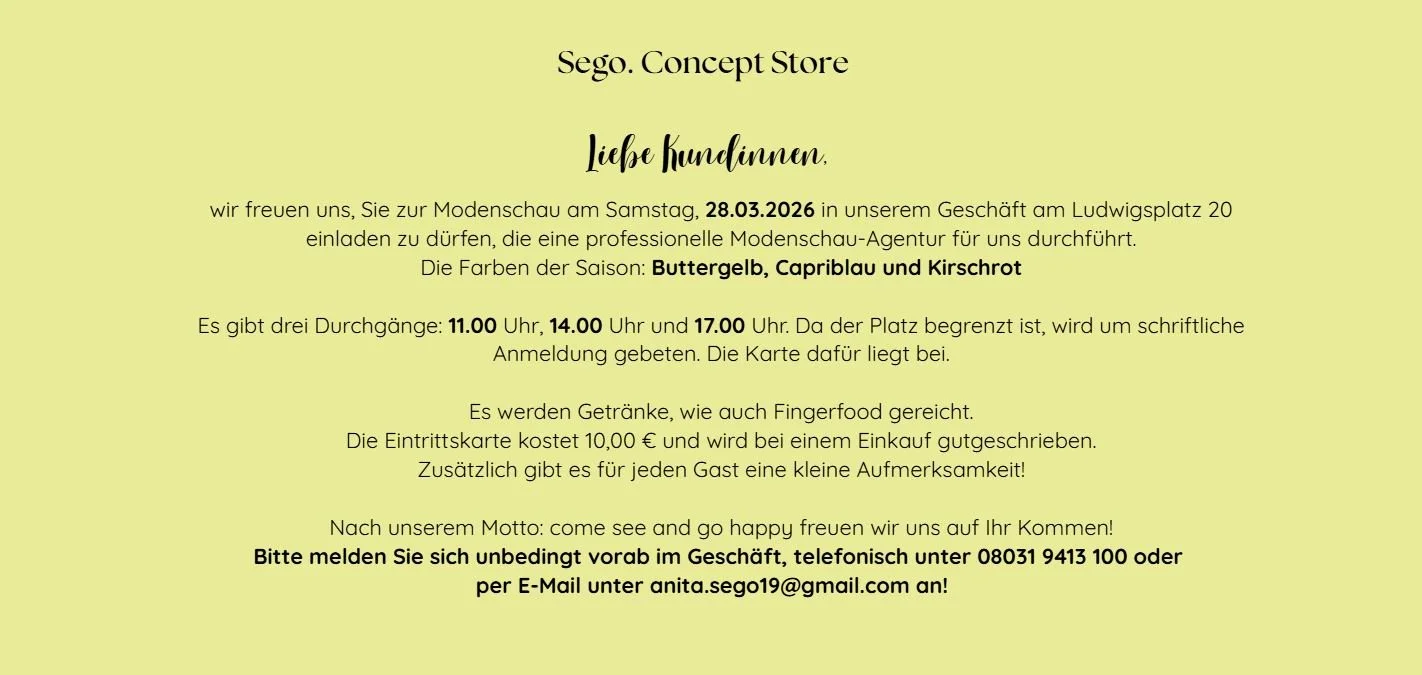 SEGOCONCEPT STORE“Come see, go happy!” Bevorstehende Events: Große Modenschau!Samstag, 28.03.2026 im Geschäft am Ludwigsplatz 20 mit 3 Durchgängen:11.00 Uhr14.00 Uhr17.00 UhrUm Reservierung wird gebeten (anita.sego19@gmail.com) Nichts verpassen. Jetzt zum Sego Newsletter anmelden! Verpasse keine Trends, Aktionen und exklusiven Rabatte mehr. E-Mail-Adresse Anmelden Willkommen bei Sego! Ab jetzt bleibst du immer auf dem Laufenden mit exklusiven News, Aktionen und aktuellen Trends direkt per Mail. Schön, dass du da bist!